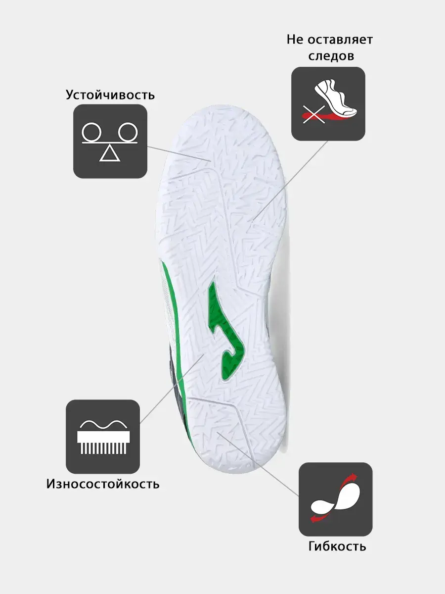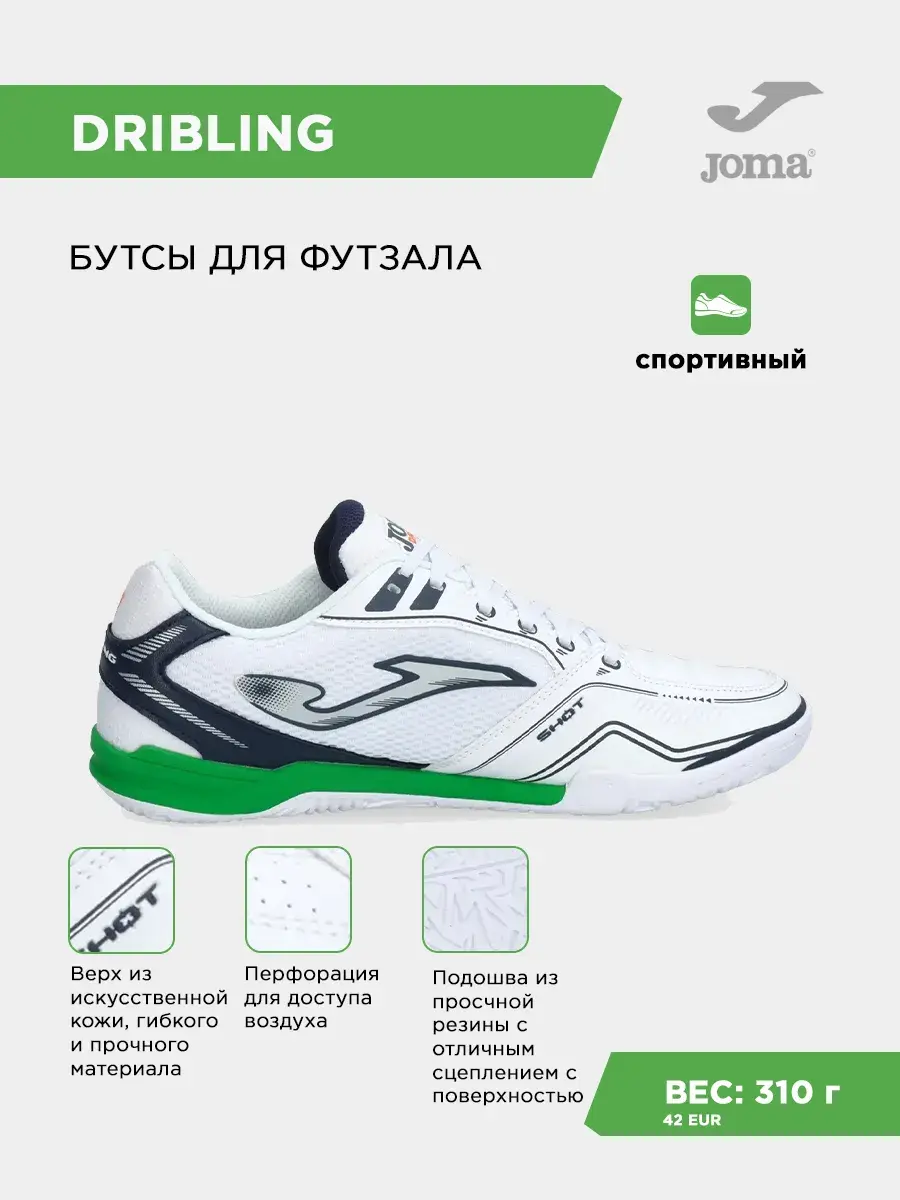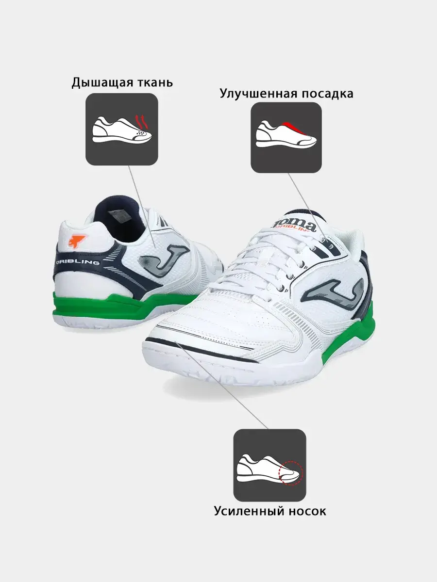 Бутсы для футзала JOMA DRIBLING предлагают уникальное сочетание качества и легкости. Эти бутсы идеально подходят для мини-футбола, обеспечивая игроку высокий уровень комфорта и защиты. DRIBLING - футбольные бутсы, созданные с учетом особенностей игры в зале, что делает их популярными среди футзалистов. Футбольная обувь из прочного синтетического материала отличается высоким уровнем износостойкости. Футзалки мужские и женские JOMA обладают отличной маневренностью, которая позволяет быстро менять направление движения. Такой подход важен для тех, кто ждет от бутс стабильной устойчивости на игровом покрытии. Качественные футбольные бутсы помогают минимизировать риск получения травм благодаря продуманному дизайну с усиленной защитой пятки и носка. Прочный материал этих гарантирует долговечность даже при интенсивной эксплуатации на паркетных площадках. DRIBLING - отличный выбор футзальной обуви. Это и футзалки для мальчика, только начинающего свою спортивную карьеру, футзалки мужские для опытного футболиста. Дышащая структура верха делает эти футзалки JOMA максимально комфортными. Доступ воздуха обеспечивается за счет применения инновационных технологий производства, ориентированных на улучшение вентиляции внутри футзальных бутс. Это способствует поддержанию оптимального микроклимата во время игры вне зависимости от ее интенсивности. Мягкий материал способствует гибкости движений, а также усиливает силу удара благодаря правильному распределению нагрузки по всей площади футзалок. Легкость конструкции позволяет чувствовать себя увереннее на поле и не отвлекаться на дискомфорт, связанный с весом обуви. Футбольные бутсы для зала JOMA Dribling являются оригинальным продуктом с хорошим соотношением цены и качества. Это делает их доступными для широкого круга покупателей, ценящих выгодные покупки без ущерба функциональности. DRIBLING без сомнений станут проявят себя на поле и как футзалки для мальчика, который мечтает о том, что его футбольные бутсы помогут ему побежда